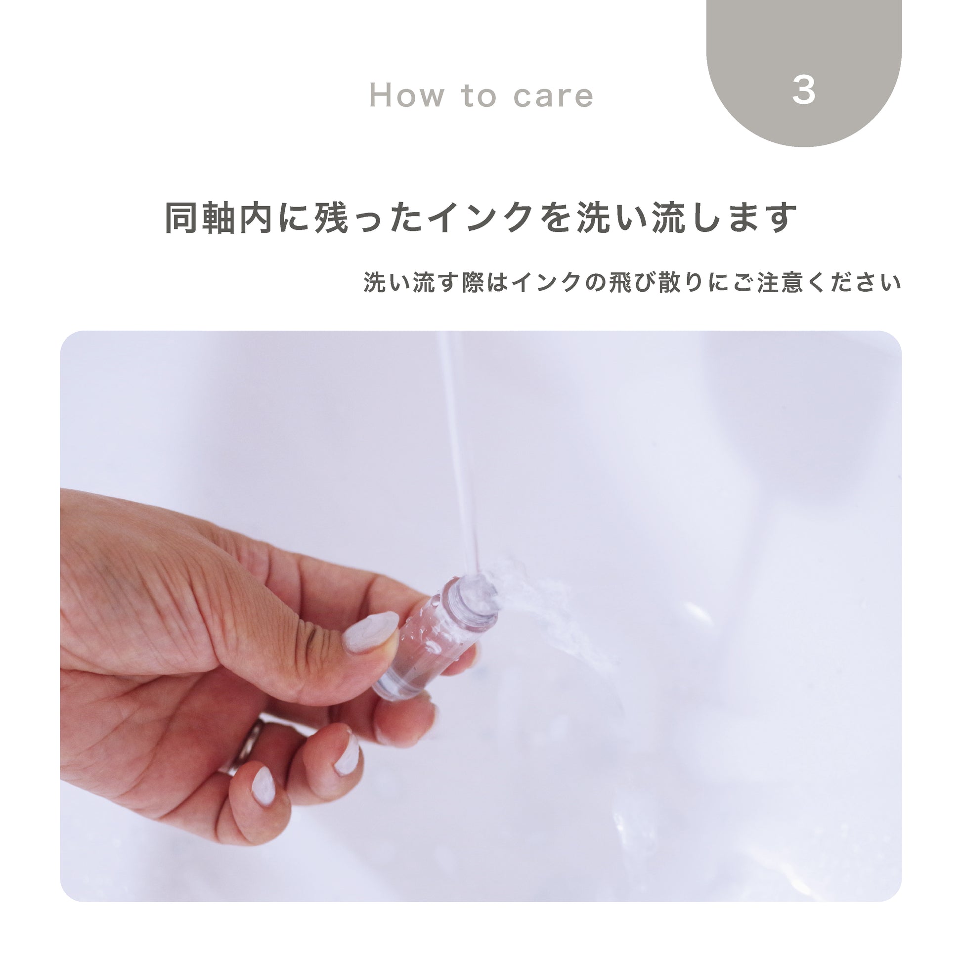 ・乾燥しないように、こまめにお使いいただくことをお勧めします(目安は1日1回)。また、3ヶ月に1回はペン先を水かぬるま湯で洗ってお手入れをしてください。